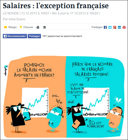 Dans ce contexte, nos 2,1% de hausse en 2012 paraissent en effet flamboyants. Comment s’explique cette augmentation ? Pour Les Echos, qui s’appuient sur la note du CAE, elle est une façon de "préserver la motivation des travailleurs et le climat social, deux déterminants essentiels de la productivité." Ainsi, "les entreprises préfèrent réduire l'emploi que les salaires". C’est bien ce qui fâche le gouvernement. Pourtant, cette même note donne une autre raison de taille, que se gardent bien de révéler Les Echos mais que Le Monde n’a pas manqué de souligner : "une partie de la hausse – environ un quart selon le CAE – est mécanique. Les destructions d'emplois observées durant cette période concernent majoritairement des salariés à faibles qualifications et faibles rémunérations, ce qui entraîne une hausse du salaire moyen des personnes ayant conservé leur emploi". Eh oui : le chiffre est une moyenne.