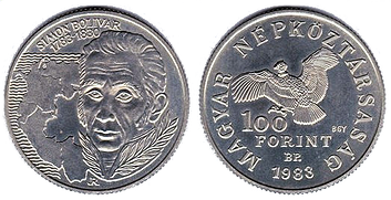 El Forinto Húngaro" y una estampilla con la efigie de Simón Bolívar, el