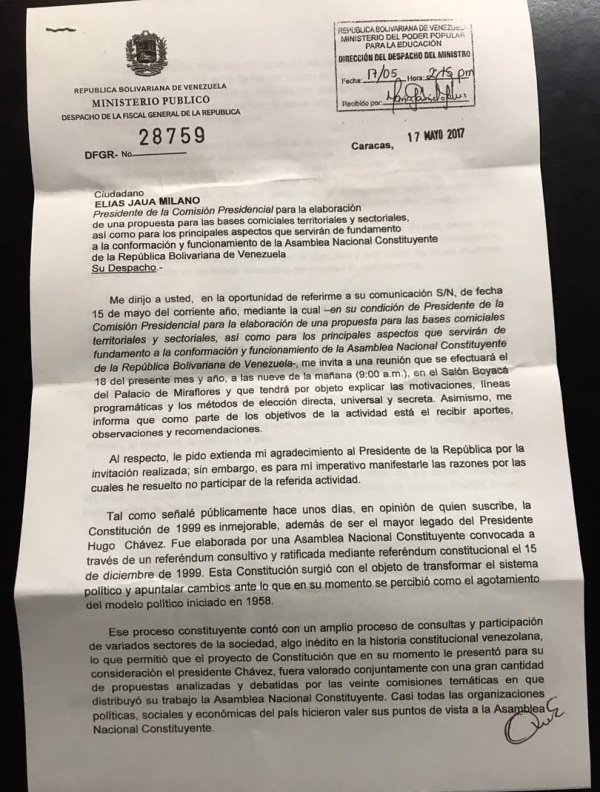 Confirmó que recibieron un documento con la opinión política de la doctora Luisa Ortega Díaz sobre la ANC, pero advirtió que sólo la Sala Constitucional puede emitir un pronunciamiento o sentencia al respecto, por lo que toman lo expresado por Ortega Díaz como “una opinión política más”, de las tantas que han recibido.- Carta publicada por medios de comunicación, con el sello de recibido del Ministerio de Educación