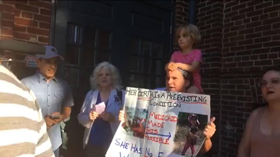 Multitud: “Hasta que ganemos”.Mientras decía esto, la activista tenía a su hija, Charley, sentada sobre sus hombros. Llevaba un cartel con la leyenda: “Su nacimiento es una afección preexistente”. Horas más tarde, cientos de activistas del grupo de defensa de los derechos de las personas con discapacidad ADAPT ocuparon un edificio de oficinas del Senado mientras coreaban: “Preferiría ir a la cárcel que morir sin Medicaid”.