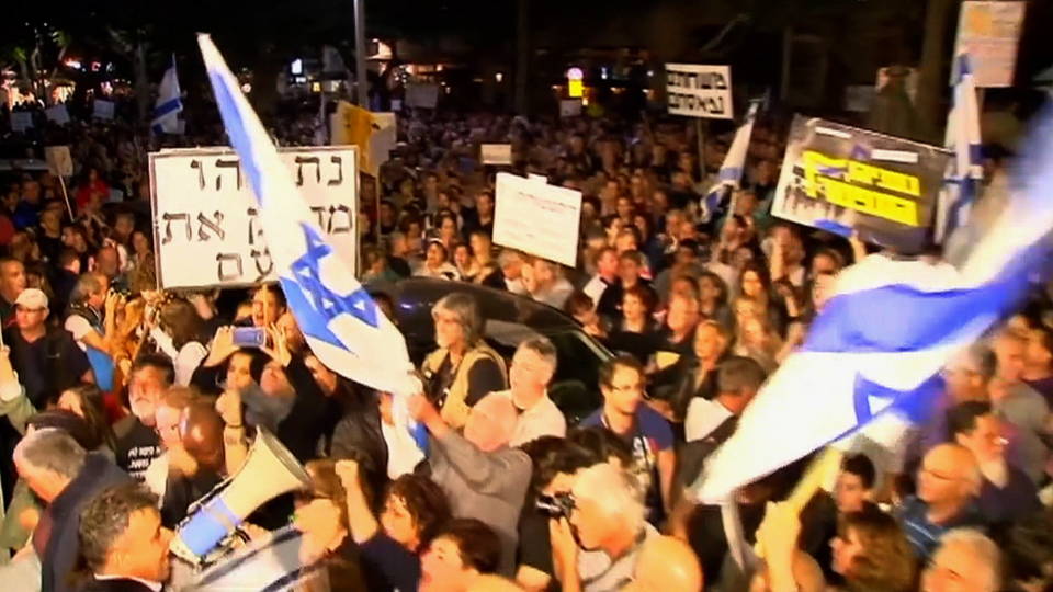 En Israel, decenas de miles de personas marcharon el sábado en Tel Aviv para pedir la renuncia del primer ministro Benjamin Netanyahu y el fin de la corrupción política. Un proyecto de ley, que se espera que apruebe el Parlamento israelí la próxima semana, le impediría a la policía publicar los hallazgos de dos investigaciones sobre Netanyahu, quien enfrenta posibles cargos penales de soborno, fraude y abuso de confianza. Netanyahu ha sido acusado, entre otros delitos, de intercambiar favores políticos por regalos de lujo, como puros y champán.