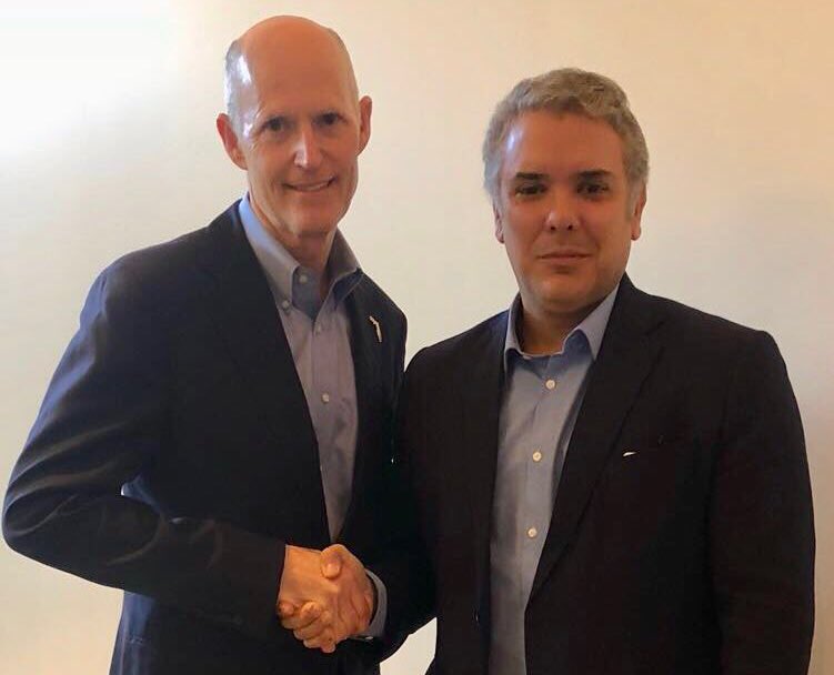Este sábado el presidente electo Iván Duque se reunió con el gobernador del Estado de Florida, Rick Scott en Miami, Estados Unidos. En el encuentro dialogaron sobre las condiciones de los colombianos que residen en el estado y de cómo se fortalecerán en su gobierno las relaciones entre los dos países.