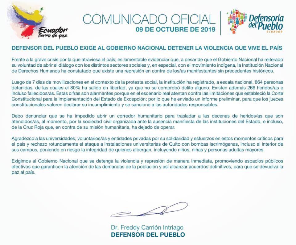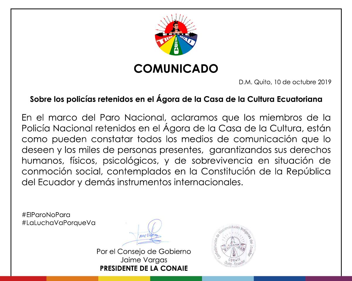 Asimismo, consideraron que la protesta de estos días, surgida desde las comunidades y provincias, para extenderse a nivel nacional, muestra el profundo descontento no solo de los pueblos indígenas como protagonistas, sino del pueblo ecuatoriano afectado por los golpes de una política económica excluyente, impuesta por el Fondo Monetario Internacional (FMI).